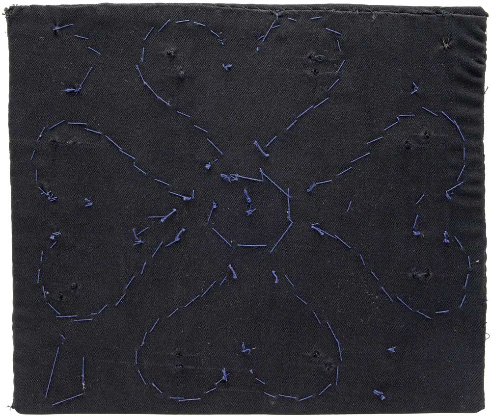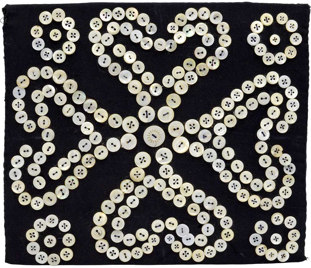 Textile artwork sewn with antique mother of pearl buttons on a black background.