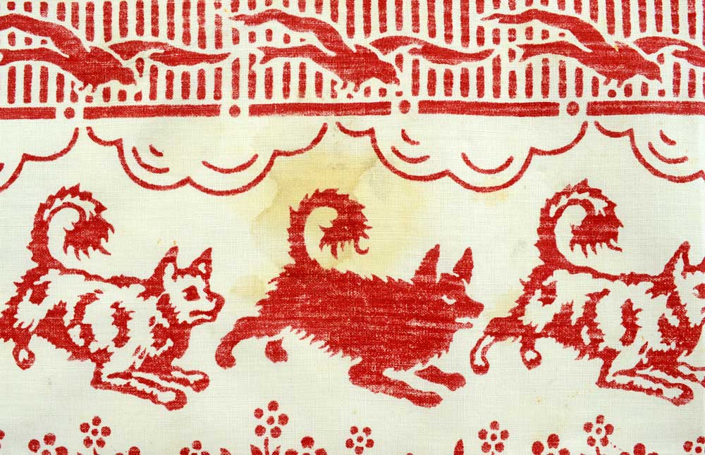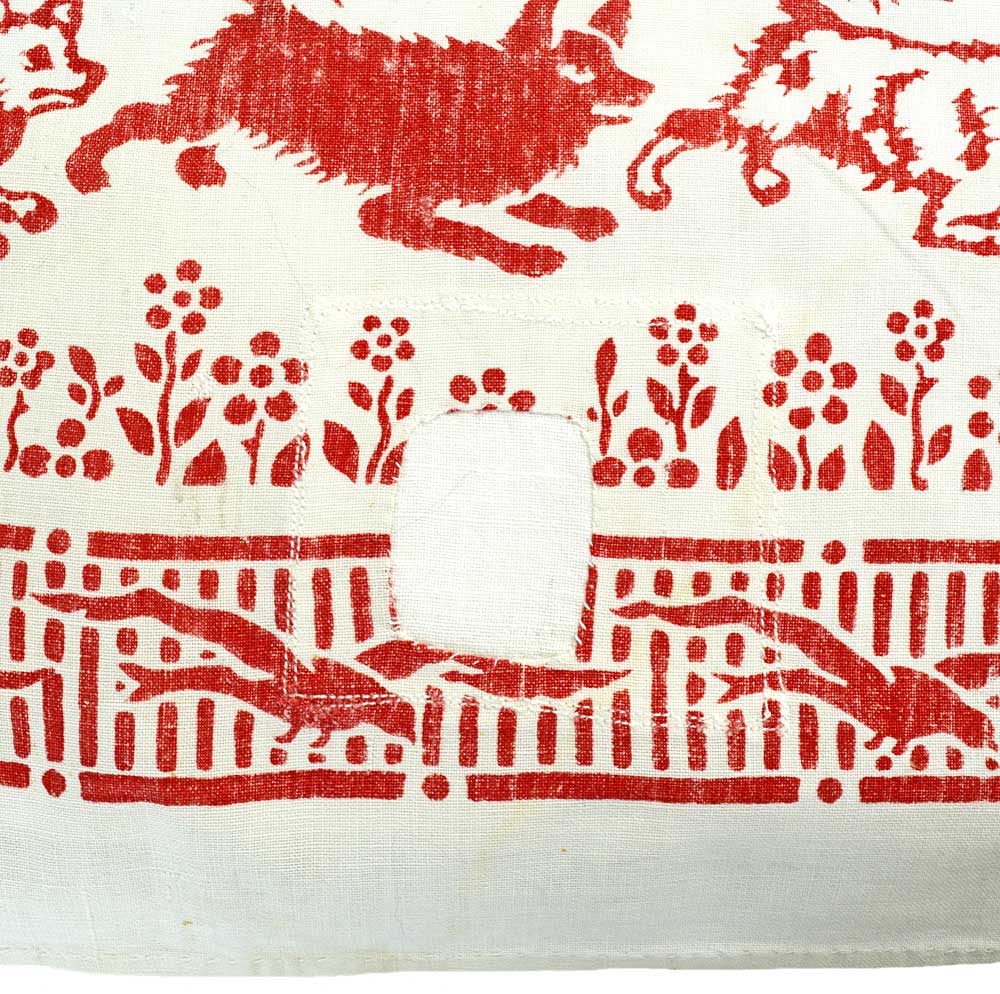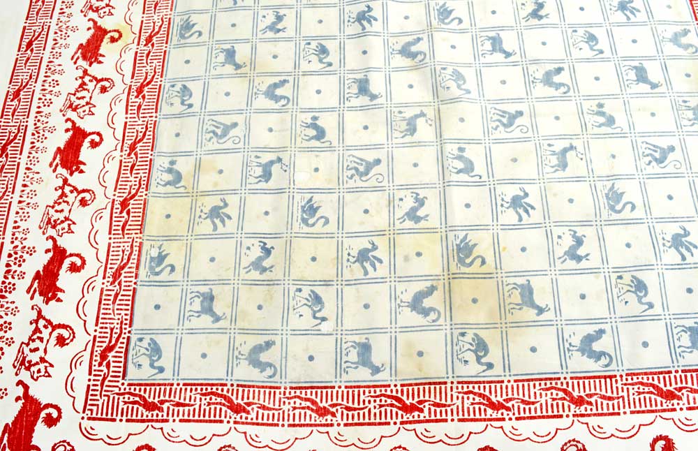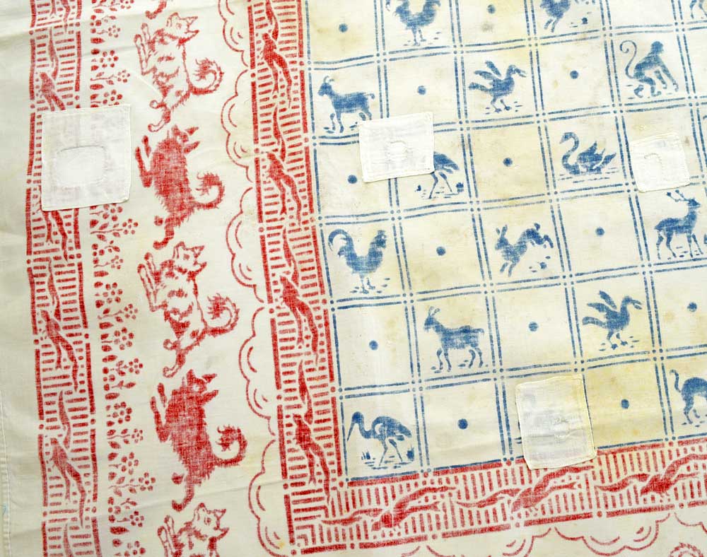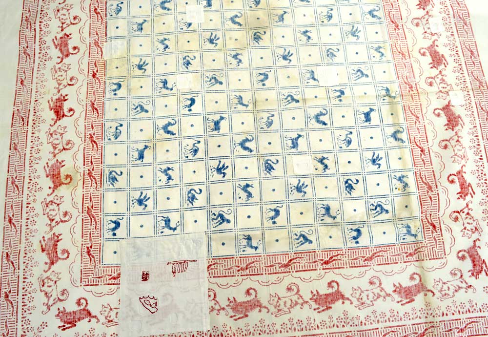 This is a large cotton cloth with the most lovely animal print. It's a folk piece, probably dating from the 1920s. The pictures are screen-printed in red and blue.
