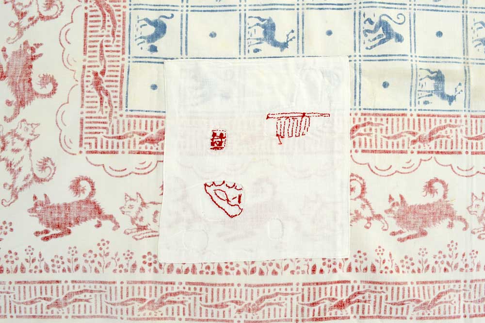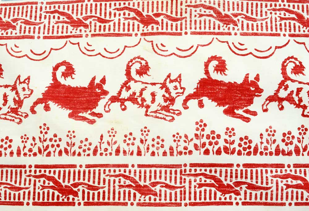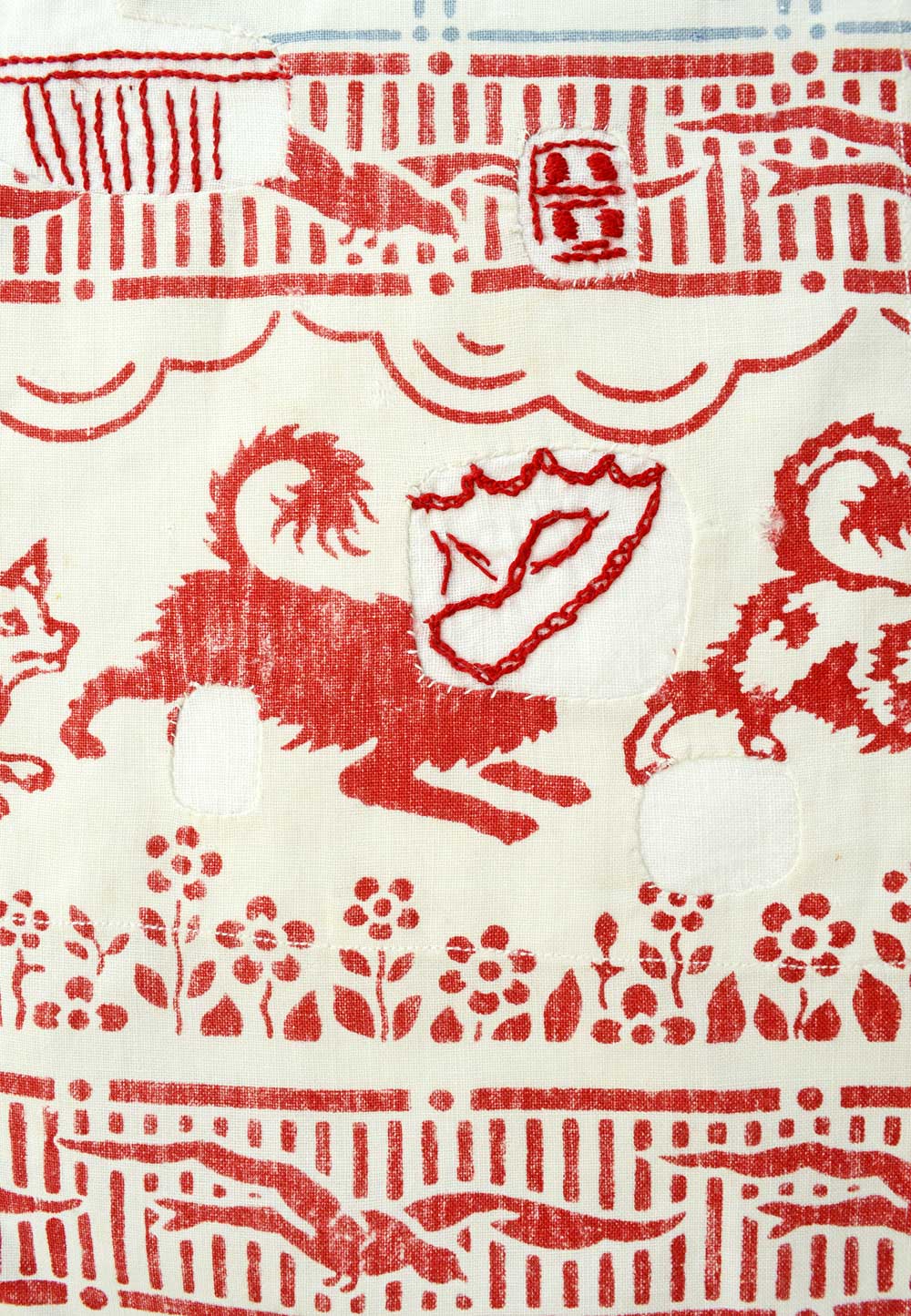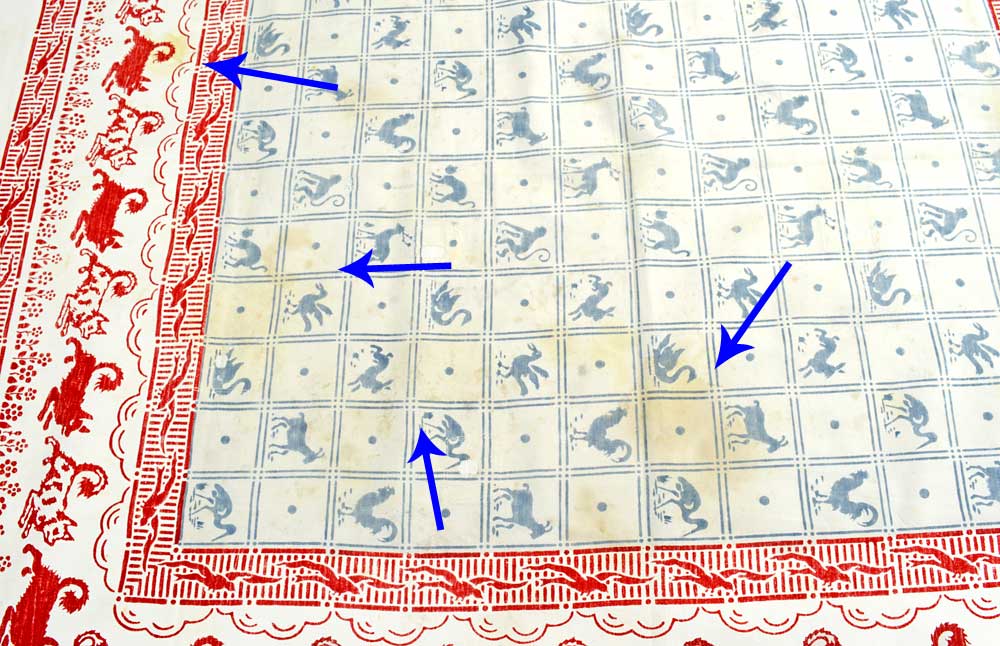 This is a large cotton cloth with the most lovely animal print. It's a folk piece, probably dating from the 1920s. The pictures are screen-printed in red and blue.